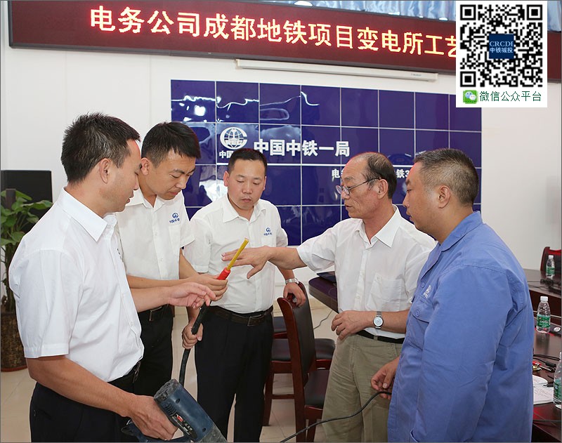 2015年7月10日、11日,在中國(guó)中鐵BT項(xiàng)目—成都地鐵3號(hào)線機(jī)電1標(biāo)項(xiàng)目部職工學(xué)校,全國(guó)知識(shí)型職工標(biāo)兵、中鐵一局電務(wù)公司電力工高級(jí)技師竇鐵成對(duì)40多名技術(shù)人員、現(xiàn)場(chǎng)施工人員進(jìn)行了變電所工藝工法培訓(xùn)。圖為竇鐵成(右二)與項(xiàng)目部技術(shù)管理人員探討電纜頭熱縮工藝。
