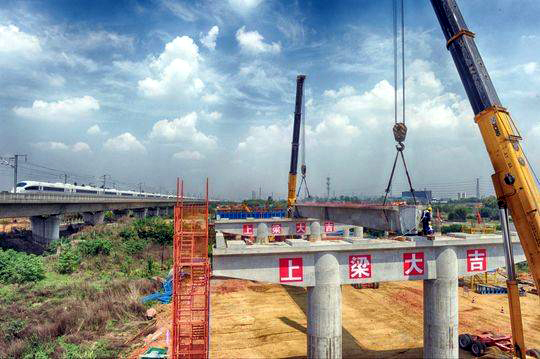 雖然現(xiàn)場(chǎng)架設(shè)只用了半個(gè)多小時(shí),但工作人員介紹,箱梁起吊、運(yùn)輸?shù)惹捌跍?zhǔn)備工作需要好幾個(gè)小時(shí)。“待兩跨之間箱梁架好后,我們將使用架橋機(jī),以加快進(jìn)度。”項(xiàng)目部技術(shù)負(fù)責(zé)人介紹,K主線1號(hào)特大橋所在的TJ2標(biāo)為全線高架“最難段”,線路全長(zhǎng)約8039米,全程為橋梁工程,共需架設(shè)3167片箱梁,平均每天要架設(shè)9-10片,而常規(guī)的高速公路架梁一片最多6片。為確保工程建設(shè)進(jìn)度,建設(shè)投入了更多的設(shè)備。